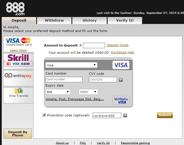 At 888 everyone receives a bonus if they deposit a minimum qualifying amount, not bad at all! So what is the amount you ask? Well you have to deposit 5 GBP, so you’ll have a total of 10 GBP in your account. The maximum bonus is 100 GBP, but you must enter the unique bonus code: verdiener888 to get the best bonus offers here at 888.